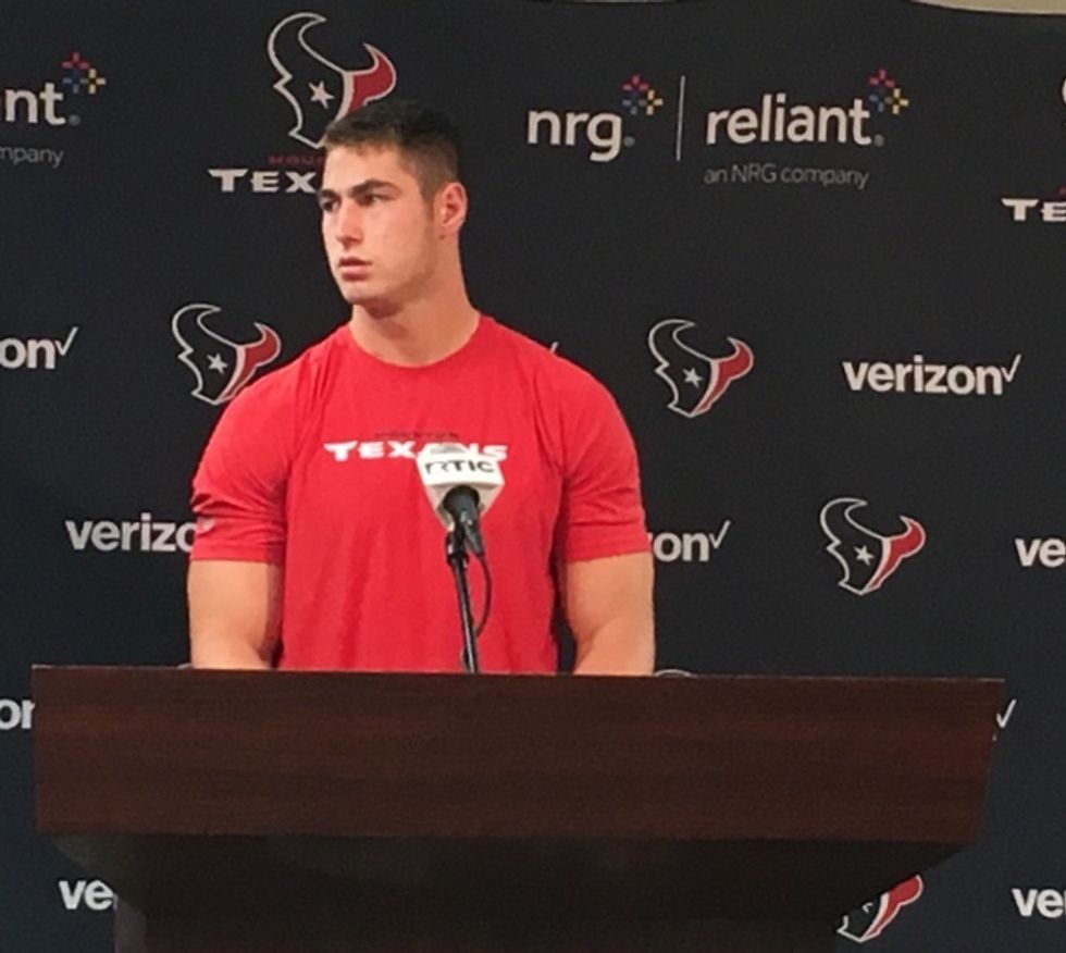 He said "all the tight ends at my position are helping" him get acclimated at the position and even Deshaun Watson is "in my ear" helping him on the field. The potential is there as he's physically gifted and has a great athlete background mentioning his basketball helping him on the field. Towards the end of the workout he hauled in a nice catch despite having shown a little fatigue earlier.