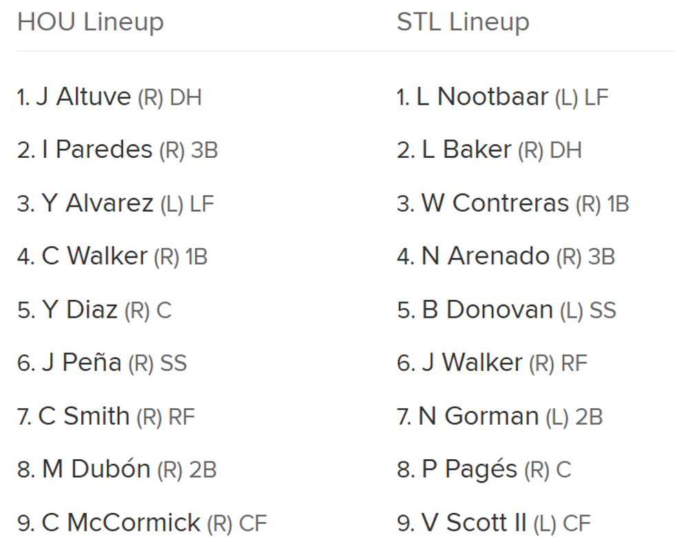 Both teams enter the matchup with identical 7-8 records but differing trends: Houston has outscored opponents by eight runs over their last 10 games (5-5), while the Cardinals have gone 4-6 during that stretch, giving up 5.19 runs per game.