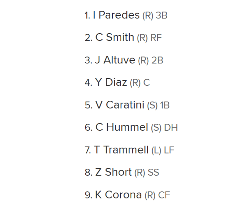 What jumps out? Cam Smith is back hitting second, with Yainer Diaz sliding into the cleanup spot and catching. With Walker on paternity leave, Victor Caratini is hitting fifth and playing first base. Cooper Hummel is the DH and hitting sixth, followed by Taylor Trammell (LF) and Zach Short (SS). Kenedy Corona will get the start in center field, as Jake Meyers dealing with a calf issue.