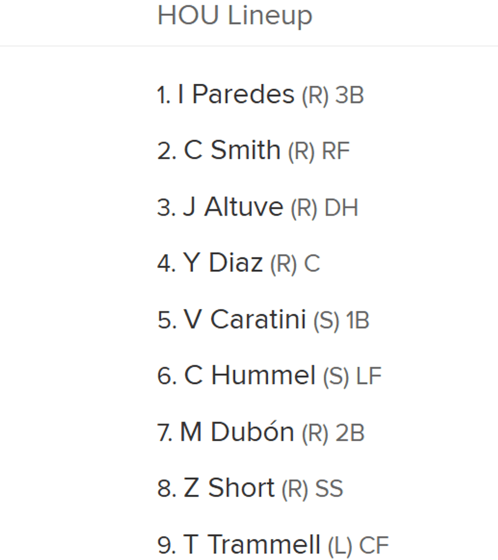 Here's an early look at Houston's lineup for Game 2. Spots 1-6 are the same as Game 1, except Cooper Hummel is playing left field, with Altuve in the DH spot. Mauricio Dubon is hitting seventh and playing second base, with Zack Short (SS) hitting eighth, followed by Taylor Trammell batting ninth and playing center field. Jake Meyers is out of the lineup again with a calf issue.