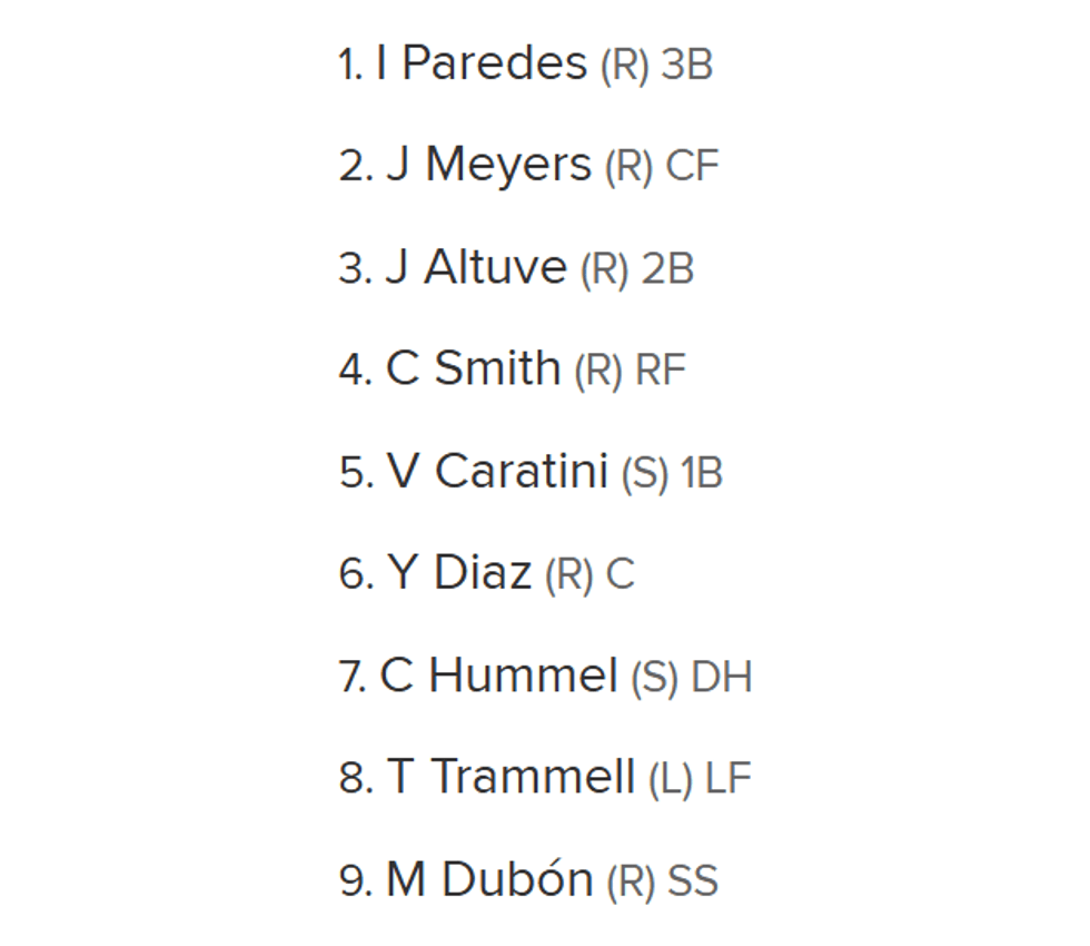 What stands out? First off, Jake Meyers returns to the lineup after missing a couple of games with a calf issue. With Meyers back in the two-spot, Cam Smith returns to hitting cleanup. Caratini is playing first base again and hitting fifth, followed by Yainer Diaz (C), Cooper Hummel (DH), Taylor Trammell (LF), and Mauricio Dubon (SS).