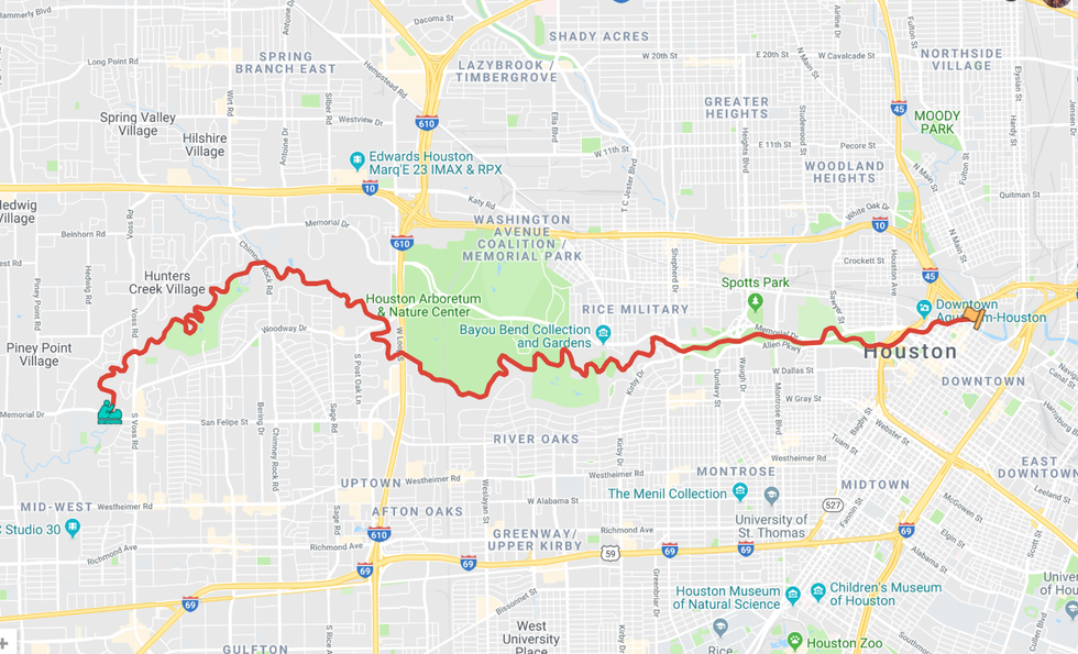 The 15-mile course is open for both competitive racing and pleasure. The race begins at 7700 San Felipe and concludes at Allen's Landing (Commerce and Main).
