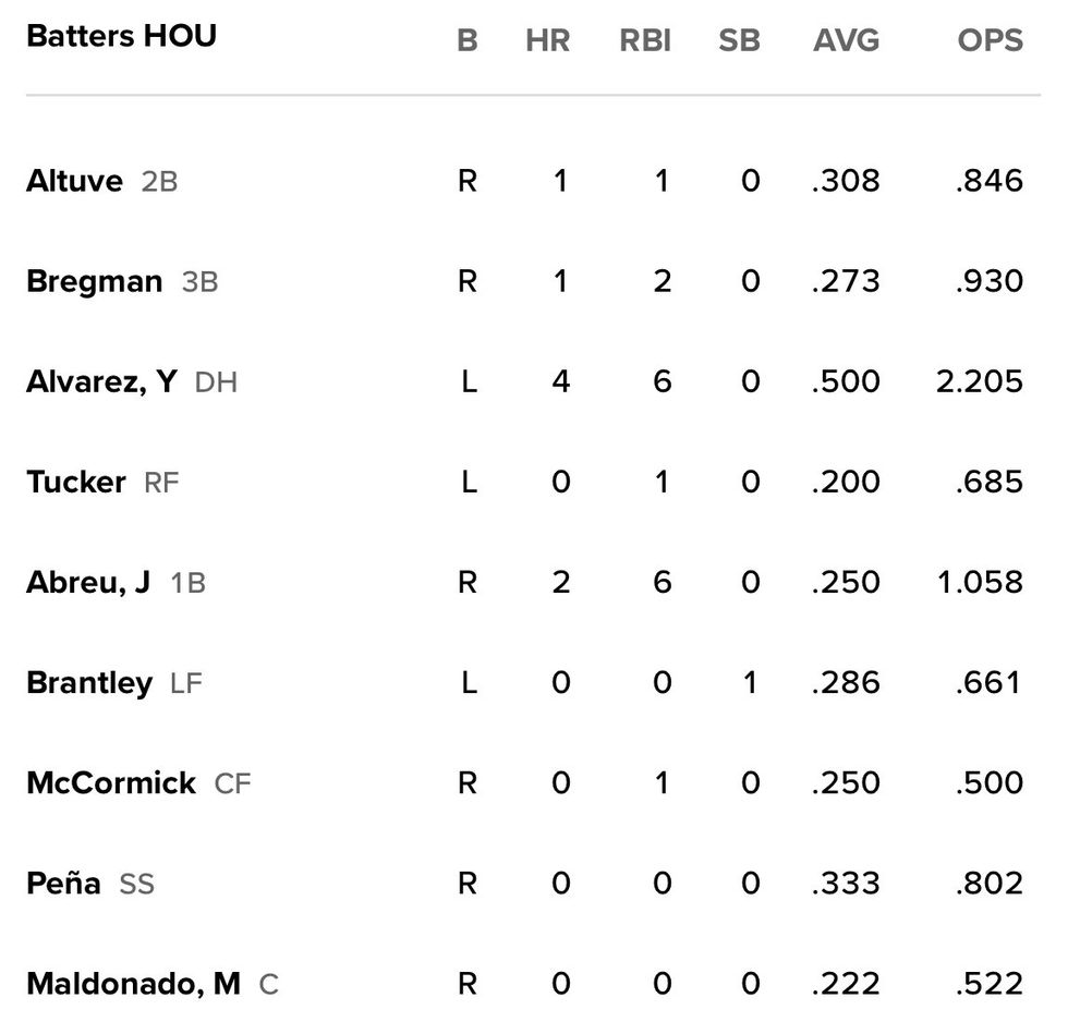 Chas McCormick returns to the lineup to play center field, and Yordan Alvarez will DH with Michael Brantley playing left field. Removing Yainer Diaz from the lineup doesn't come as a surprise, he struggled in Game 3 going 0-5 with 4 strikeouts.