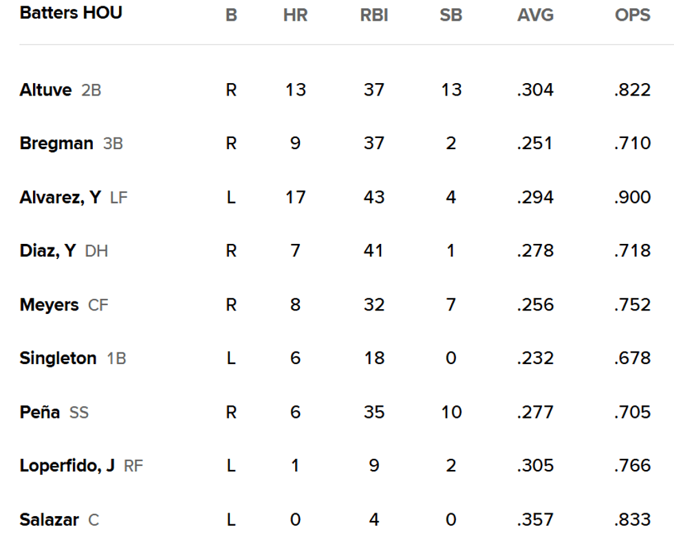 Jose Altuve has a .304 batting average to lead the Astros, and has 17 doubles and 13 home runs. Yainer Diaz is 17-for-42 with eight RBI over the last 10 games.