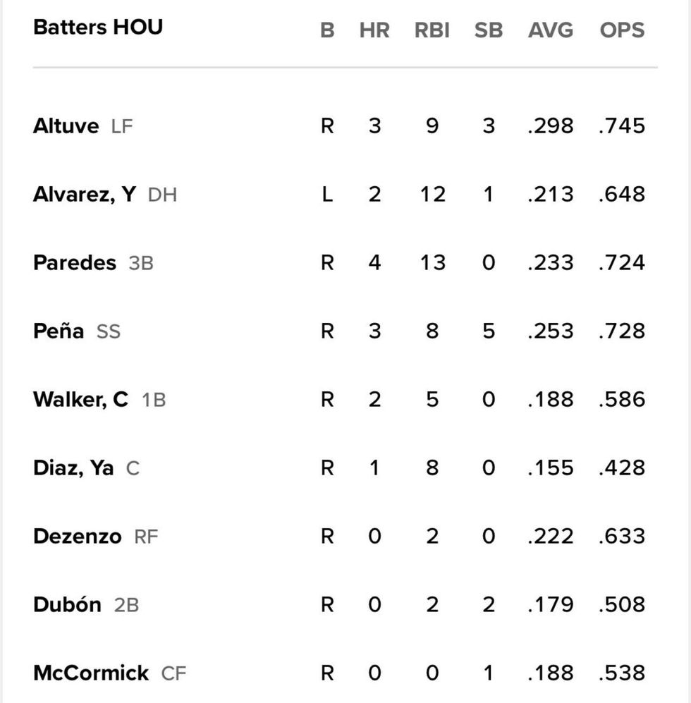 Jeremy Peña continues to spark the Astros lineup with three homers and three doubles, while catcher Yainer Diaz has added timely hits despite a recent slump. For Toronto, George Springer leads the team with a .333 average, and Bo Bichette has been steady at the plate, going 14-for-45 over his last 10 games.