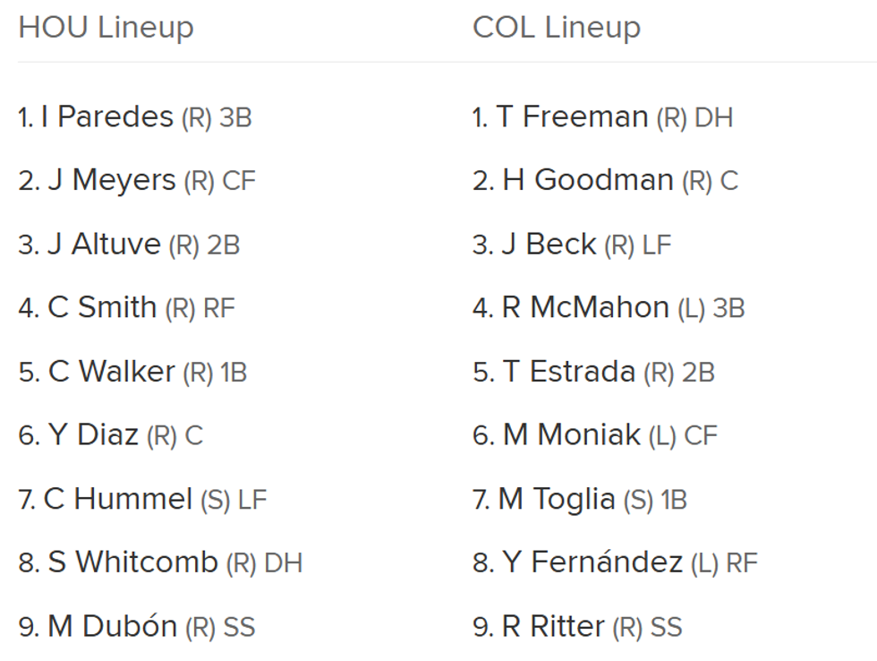 The first thing that jumps out is Christian Walker is hitting fifth after a three-hit game on Tuesday. Cooper Hummel is hitting seventh and playing left field, with Altuve playing second base again. Shay Whitcomb is in the DH spot, and hitting eighth, followed by Mauricio Dubon. Clearly, Houston's depth will be tested with this lineup. But at least they're playing the lowly Rockies.