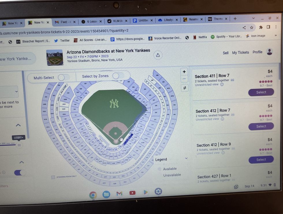 While I’m up there, I figured I’d go to a Yankees game. The Bombers are home that weekend against the Arizona Diamondbacks. Since the Yankees are averaging 41,054 fans this year, I figured my best chance of getting a good ticket was on StubHub or another secondary market site.