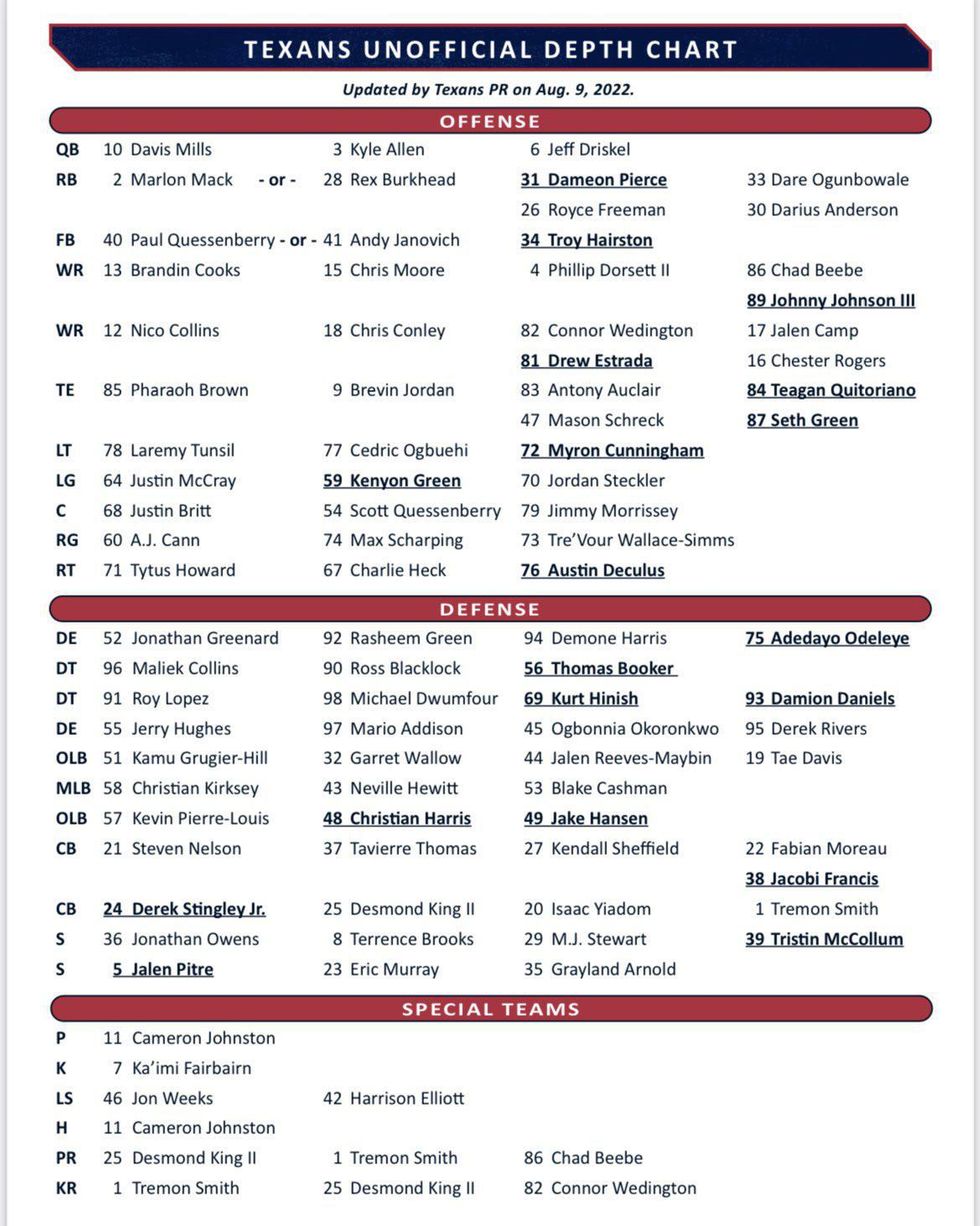 What I noticed is the rookies and younger guys are no longer buried on the depth chart simply because they're rookies or inexperienced. Derek Stingley Jr. and Jalen Pitre are starters because they've played themselves into those positions. Kenyon Green has been banged up, or else he'd also be a starter. Christian Harris is a backup, for now, because the vets in front of him have a better grasp of the scheme so far. Nico Collins and Davis Mills have proven themselves to be head and shoulders above the others at their respective positions (#2 receiver and starting quarterback respectively).