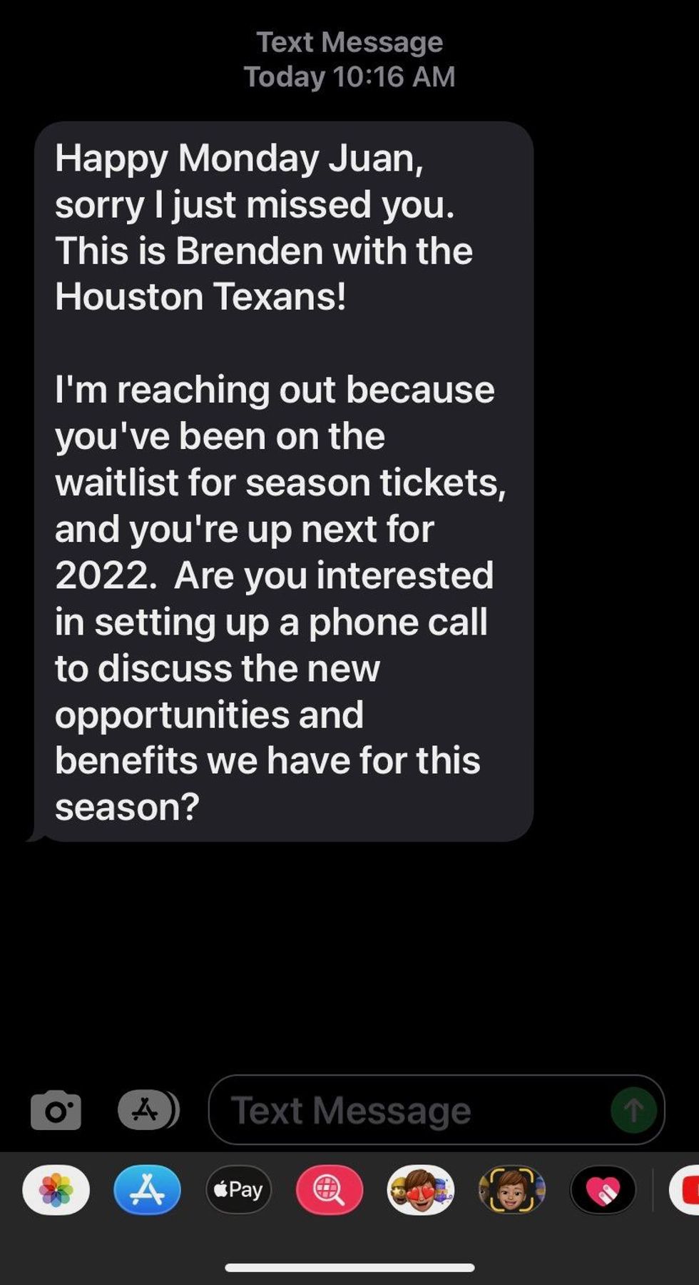 He's a long time Texans supporter. He buys jerseys, shirts, hats, the whole nine. While looking forward to the day he'd get this text, his feelings had changed. He's no longer interested because he's still unsure about the direction of the team. Mind you, he's not as hardcore as some fans are, but he supports his team. I've also talked to others who jumped at the chance of getting season tickets. Some of them are hardcores, the others are more casual like Juan. They see the vision and like where things are headed. Some are looking at it as an investment.