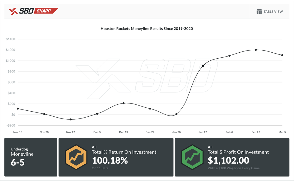 Today we will focus on the Rockets via SBD Sharp, a trend-based site that takes a different approach. Basically, it acts as a data tool that looks at teams and leagues performances over time, and tracks how much money could have been made based on different plays, including ATS, money line and over/unders.