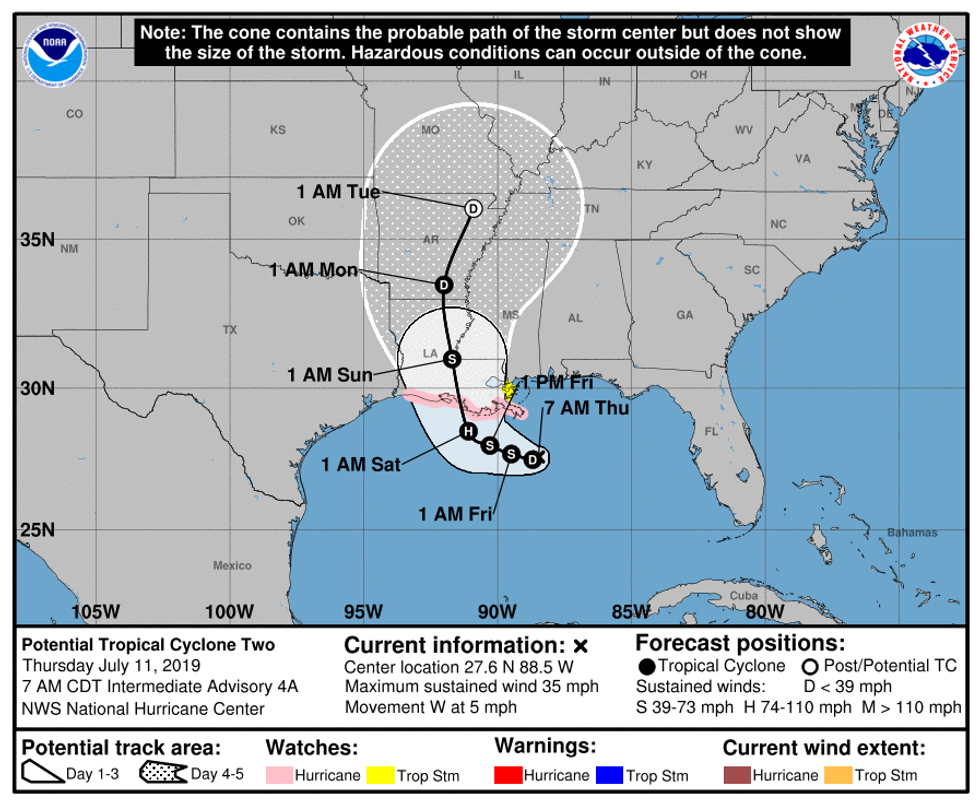 This morning the storm has (finally) officially be upgraded to Tropical Depression Two. This upgrade means the National Hurricane Center has found a closed circulation around which the storm is building. Once sustained winds in this center reach 39 MPH it will be upgraded to Tropical Storm Barry. This will probably happen at some point today.