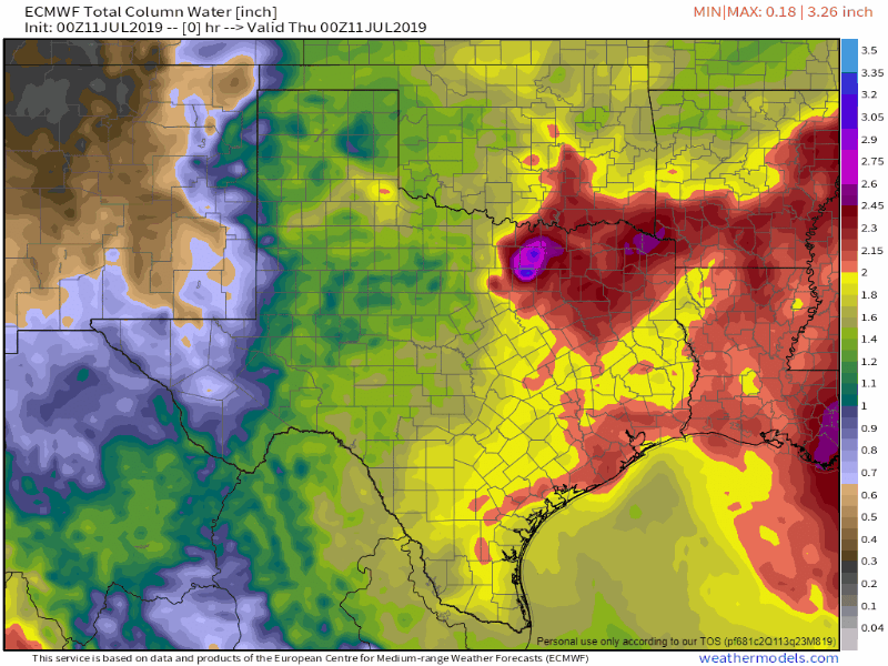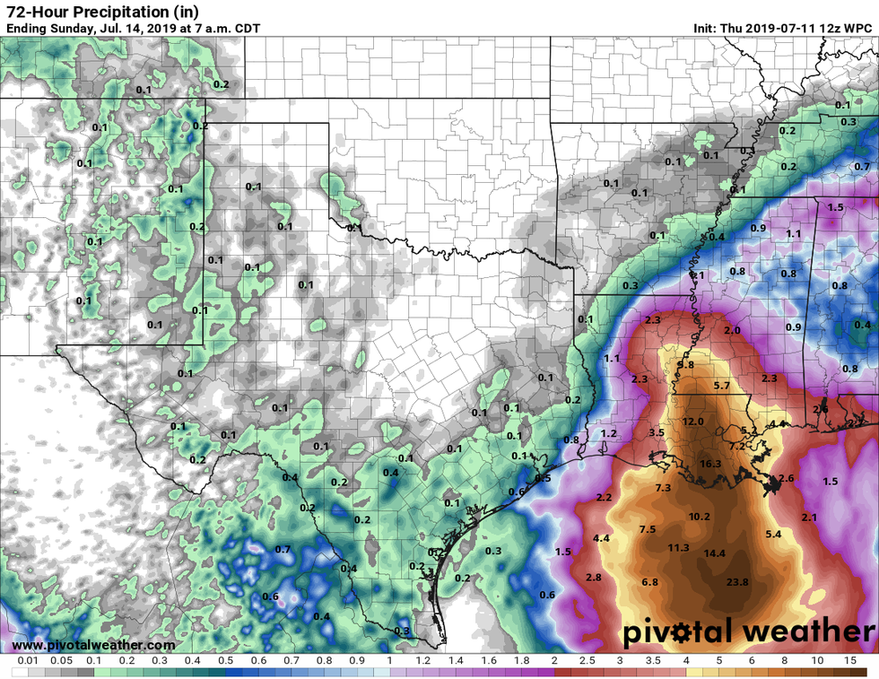 Track: Models have continued to come into much better agreement that Louisiana's central coast will be Barry's destination. The National Hurricane Center has removed all of the Texas coastline from the "cone of uncertainty" meaning barring some totally drastic and crazy surprise we are mostly in the clear. I don't want to say that our chance of significant impact from Barry is 0% until the storm is actually north of our latitude, but I feel comfortable saying that our chance is less than 5%.