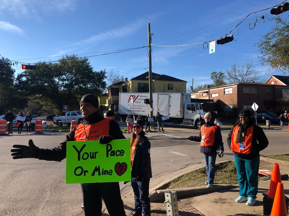 Our sector captain came bearing many gifts. The coffee, kolaches, and donuts were cool, but everyone was waiting on their official race crew jackets. We all lined up for our very own navy blue windbreaker jacket with the Chevron Houston Marathon Logo and RACE CREW printed across the back.